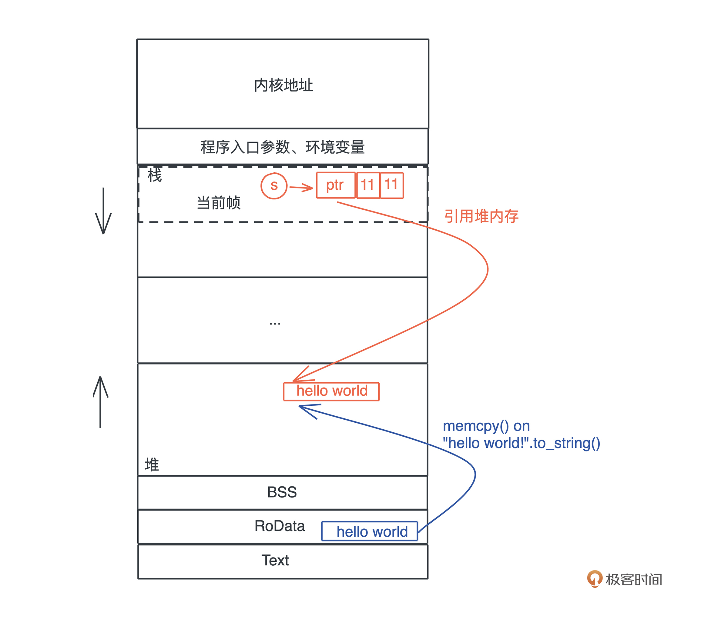 当执行 “hello world”.to_string() 时,在堆上,一块新的内存被分配出来,并把 “hello world” 逐个字节拷贝过去。