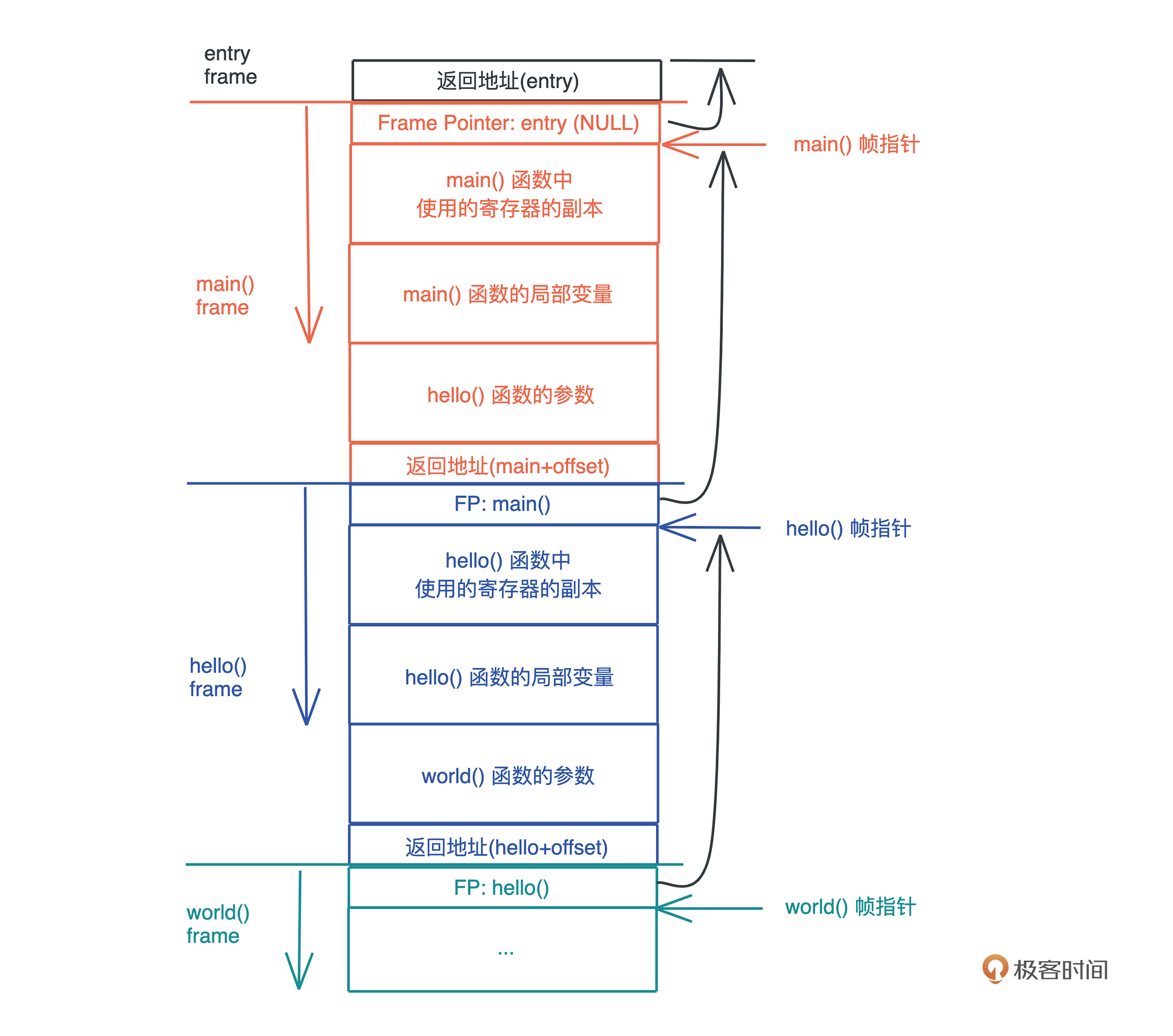 我们知道,栈是自顶向下增长的,一个程序的调用栈最底部,除去入口帧(entry frame),就是 main() 函数对应的帧,而随着 main() 函数一层层调用,栈会一层层扩展;调用结束,栈又会一层层回溯,把内存释放回去。