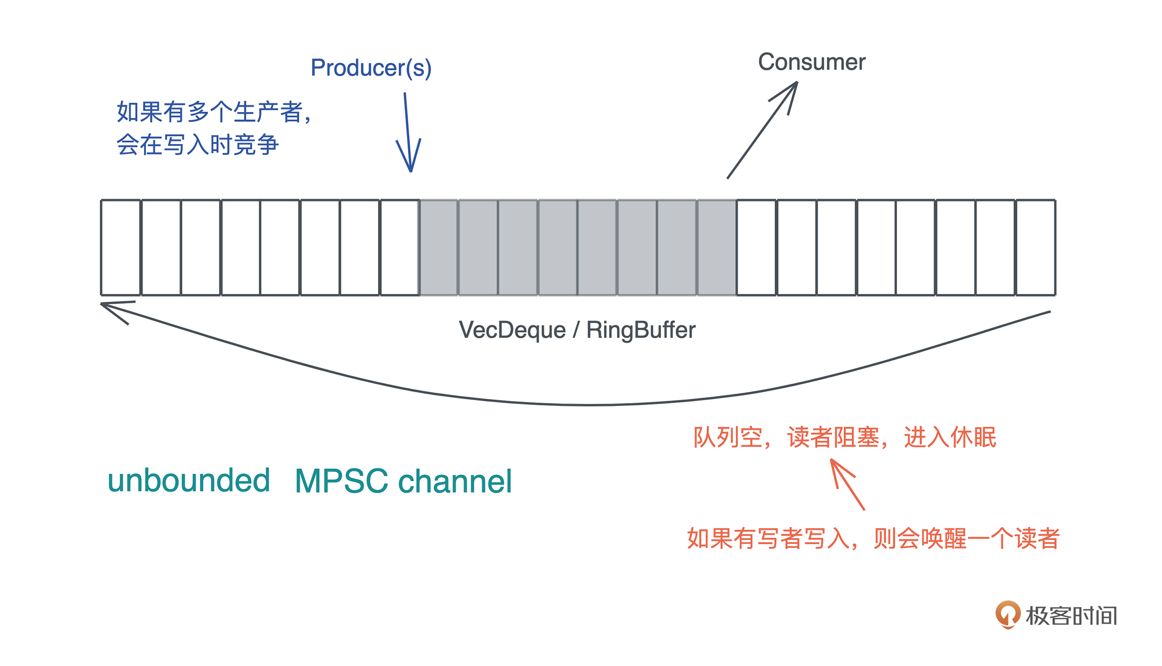 好,来看看今天要实现的 MPSC channel 的基本功能。为了简便起见,我们只关心 unbounded MPSC channel。也就是说,当队列容量不够时,会自动扩容,所以, 任何时候生产者写入数据都不会被阻塞,但是当队列中没有数据时,消费者会被阻塞: