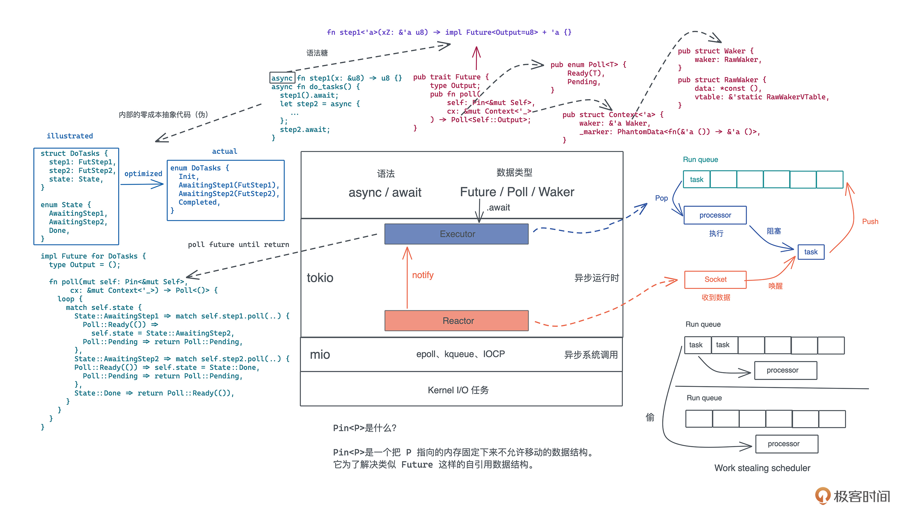 这一讲我们深入地探讨了 Future 接口各个部分Context、Pin/Unpin的含义,以及 async/await 这样漂亮的接口之下会产生什么样子的代码。