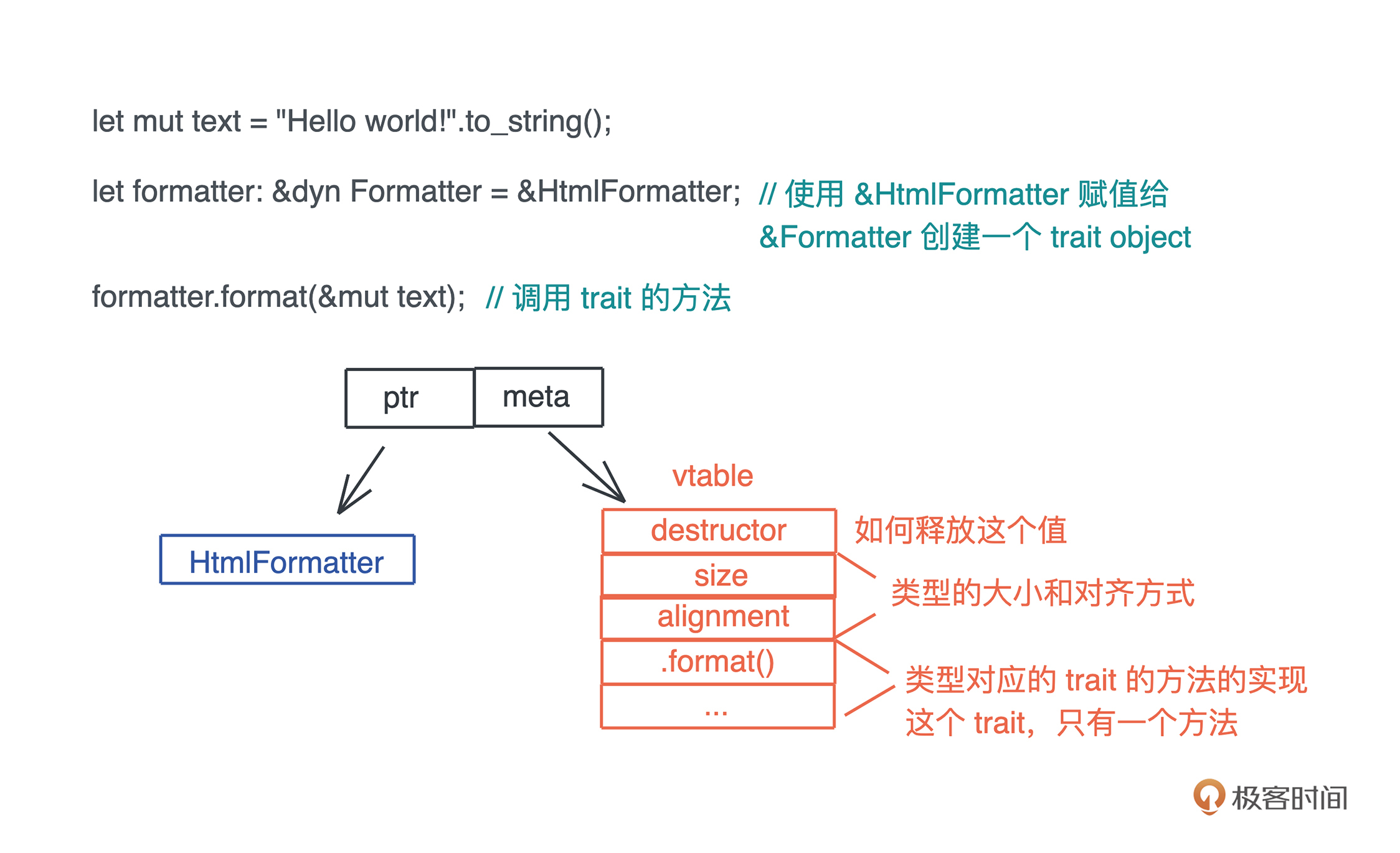 另外,有同学可能好奇为什么我说“ vtable 会为每个类型的每个 trait 实现生成一张表”。这个并没有在任何公开的文档中提及,不过既然它是一个数据结构,我们就可以通过打印它的地址来追踪它的行为。我写了一段代码,你可以自行运行来进一步加深对 vtable 的理解( 代码):