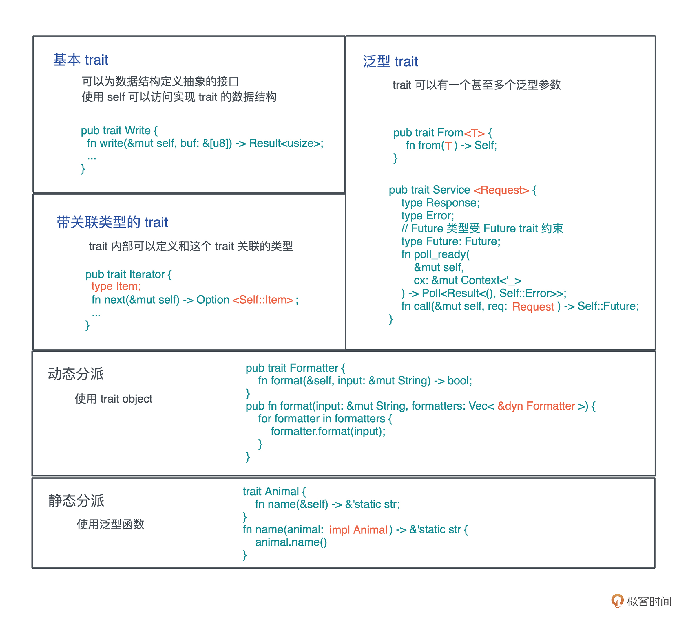 今天完整地介绍了 trait 是如何定义和使用的,包括最基本的 trait、带关联类型的 trait,以及泛型 trait。我们还回顾了通过 trait 做静态分发以及使用 trait object 做动态分发。