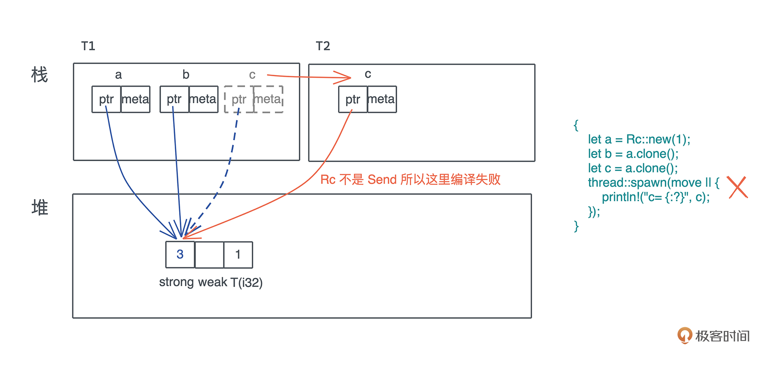 #![allow(unused)] fn main() { // Rc 既不是 Send,也不是 Sync fn rc_is_not_send_and_sync() { let a = Rc::new(1); let b = a.clone(); let c = a.clone(); thread::spawn(move || { println!("c= {:?}", c); }); } }