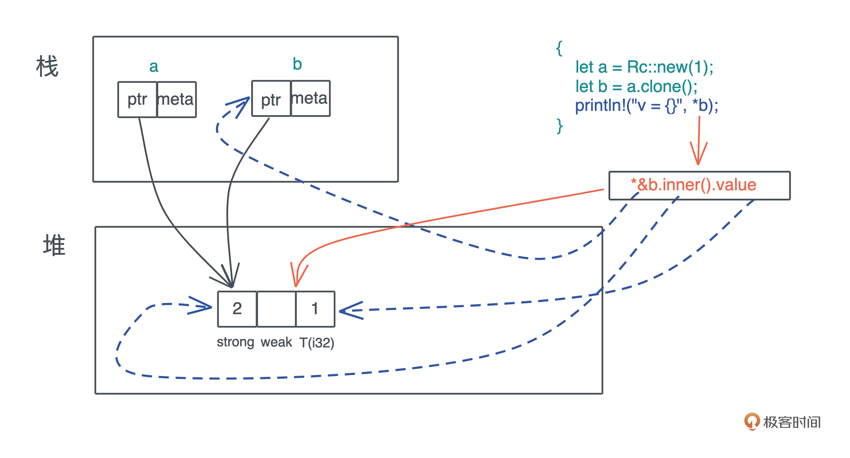 值得注意的是,clone 方法的接口是 &self,这在绝大多数场合下都是适用的,我们在 clone 一个数据时只需要有已有数据的只读引用。但对 Rc