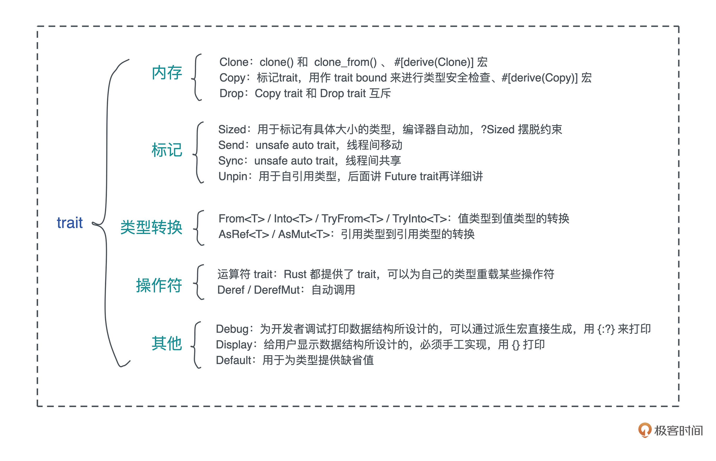 我们会再学习几类重要的 trait,包括和内存分配释放相关的 trait、用于区别不同类型协助编译器做类型安全检查的标记 trait、进行类型转换的 trait、操作符相关的 trait,以及 Debug/Display/Default。