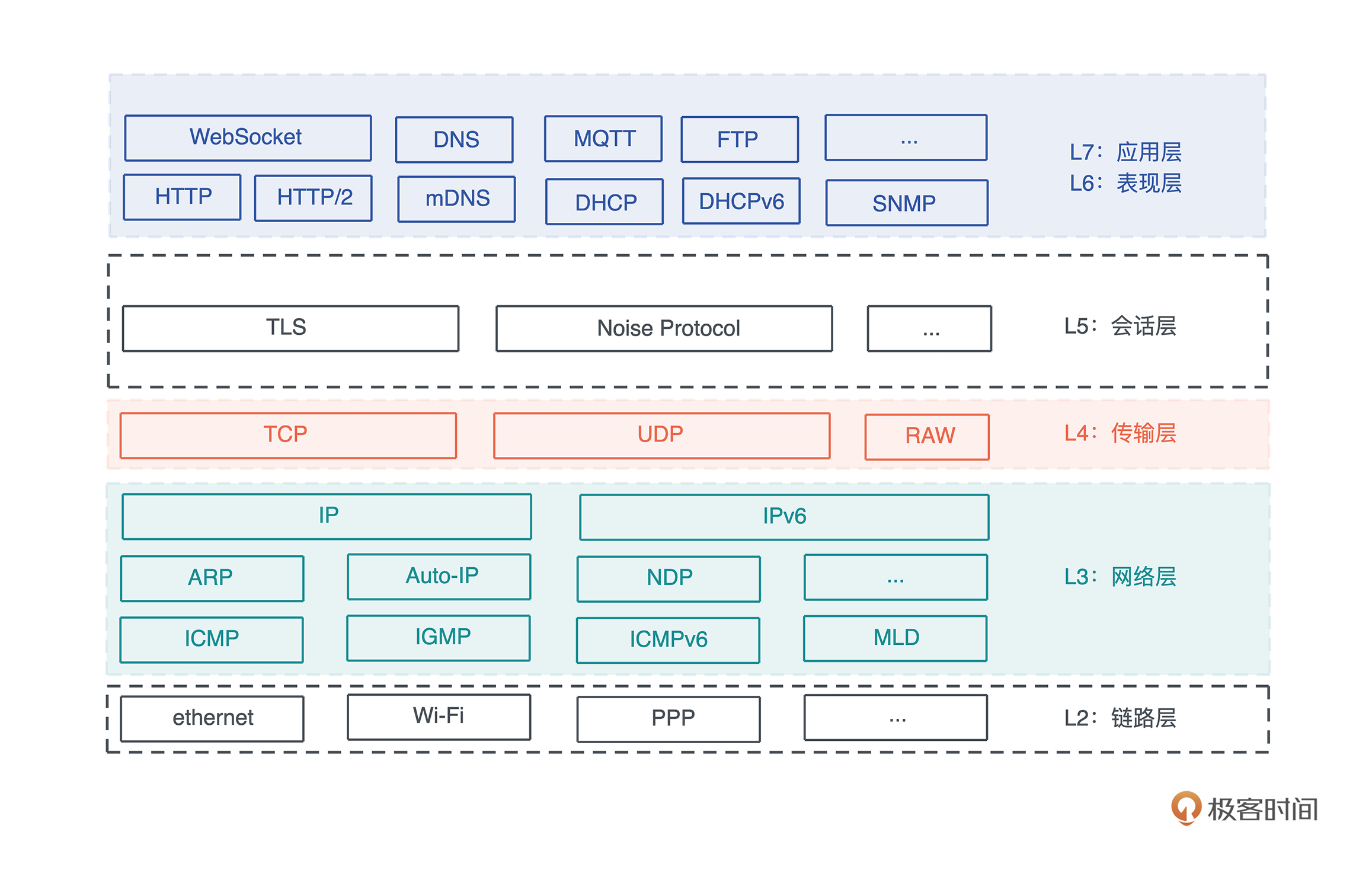 网络层目前 IPv4 和 IPv6 分庭抗礼,IPv6 还未完全对 IPv4 取而代之;传输层除了对延迟非常敏感的应用(比如游戏),绝大多数应用都使用 TCP;而在应用层,对用户友好,且对防火墙友好的 HTTP 协议家族:HTTP、WebSocket、HTTP/2,以及尚处在草案之中的 HTTP/3,在漫长的进化中,脱颖而出,成为应用程序主流的选择。