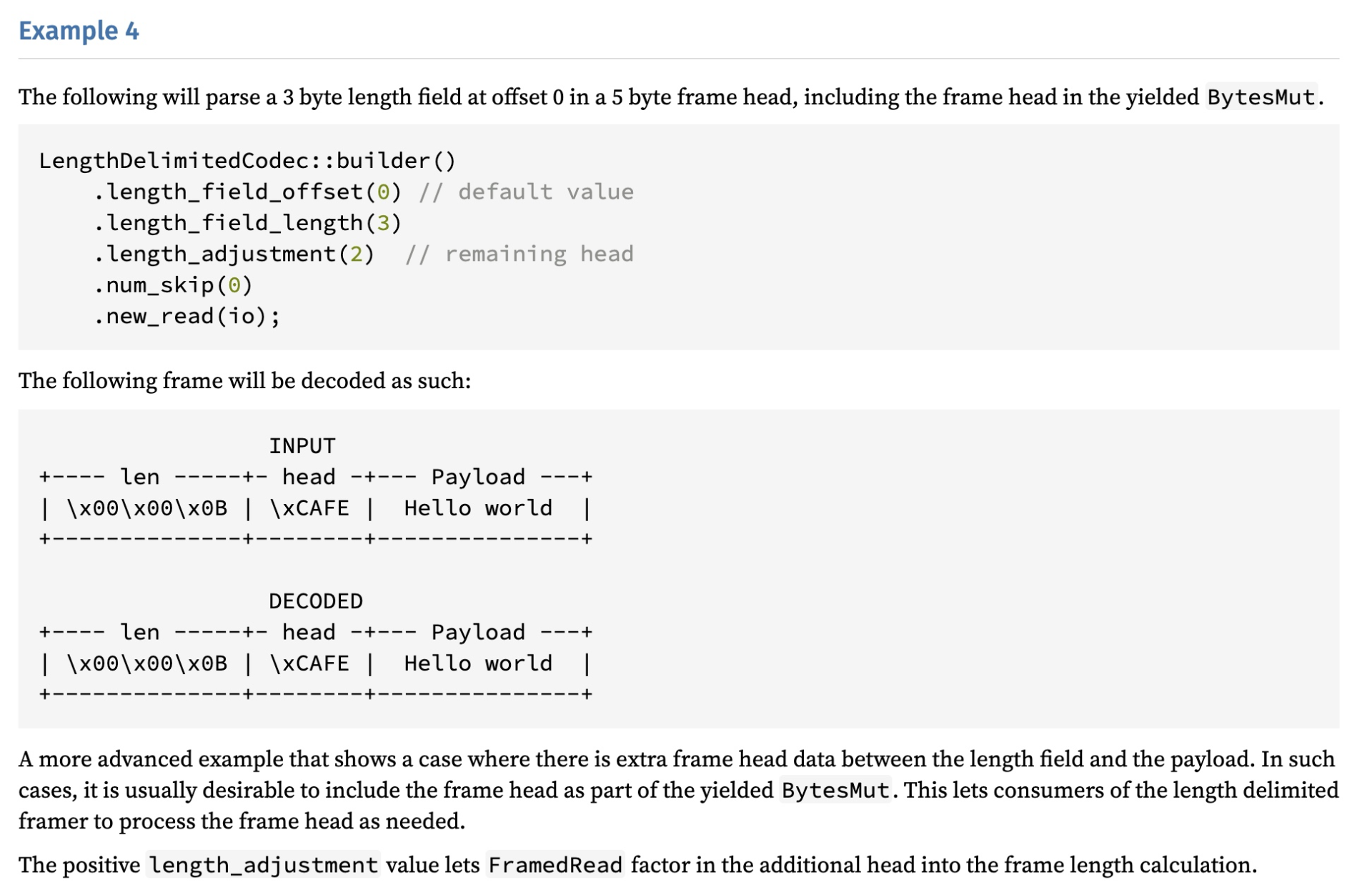比如消息有一个固定的消息头,其中包含 3 字节长度,5 字节其它内容,LengthDelimitedCodec 处理完后,会把完整的数据给你。你也可以通过 num_skip(3) 把长度丢弃,总之非常灵活: