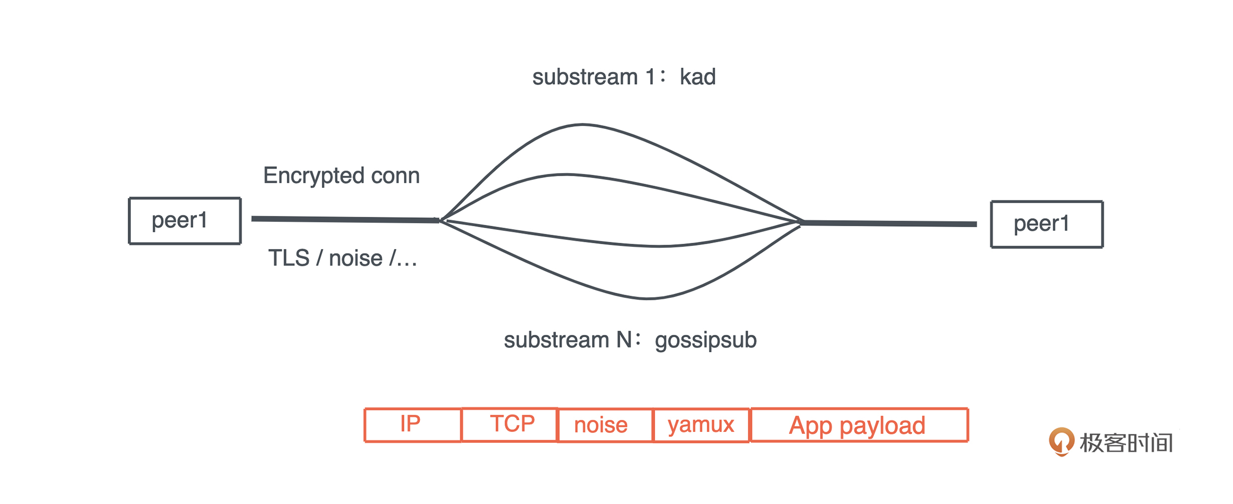 所以我们会看到,P2P 协议的连接,往往在一个 TCP 连接中,使用类似 yamux 的多路复用协议来承载很多其他协议: