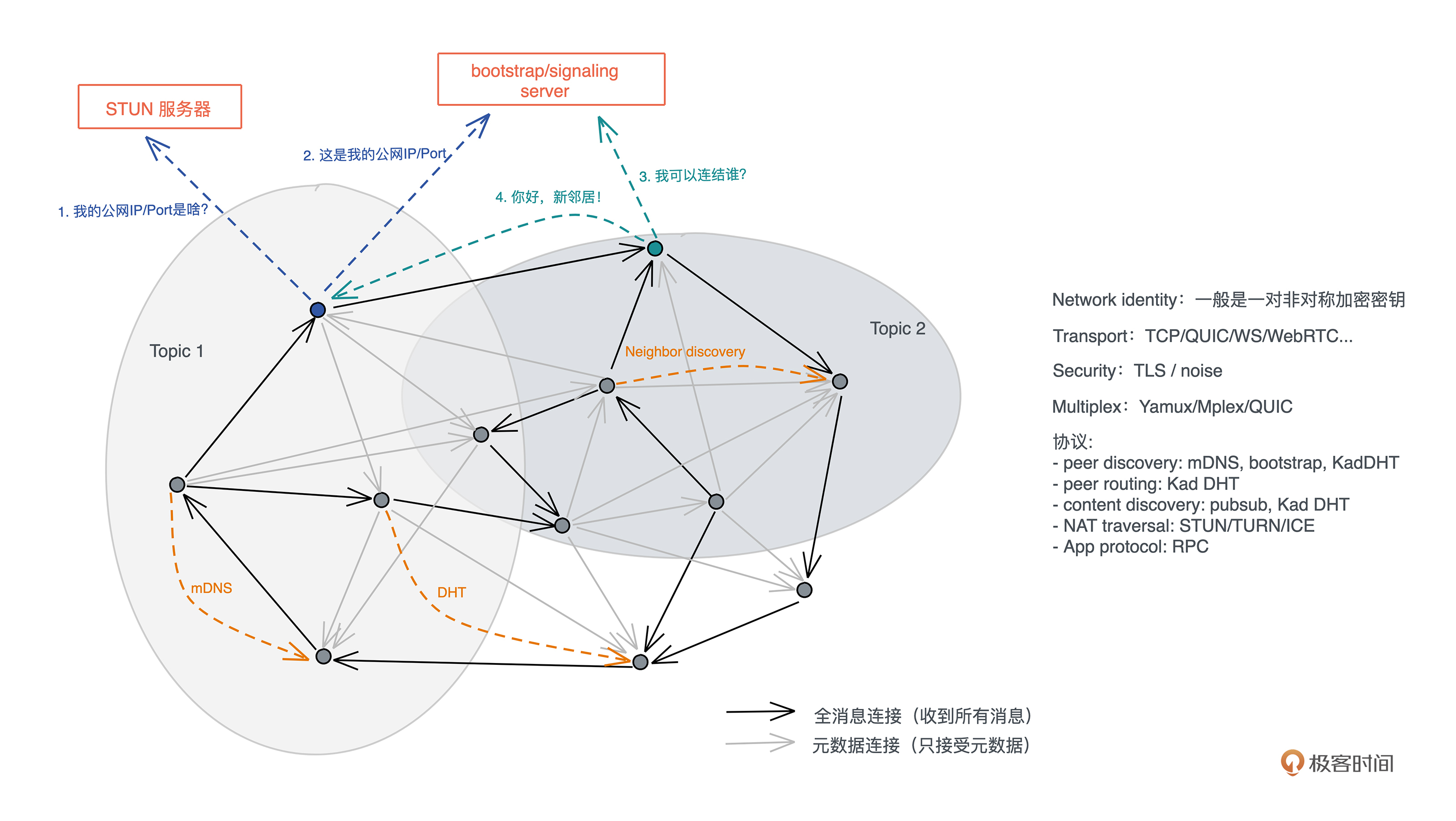 P2P 网络的构建,一般要比客户端/服务器网络复杂,因为节点间的连接要承载很多协议:节点发现(mDNS、bootstrap、Kad DHT)、节点路由(Kad DHT)、内容发现(pubsub、Kad DHT)以及应用层协议。同时,连接的安全性受到的挑战也和之前不同。