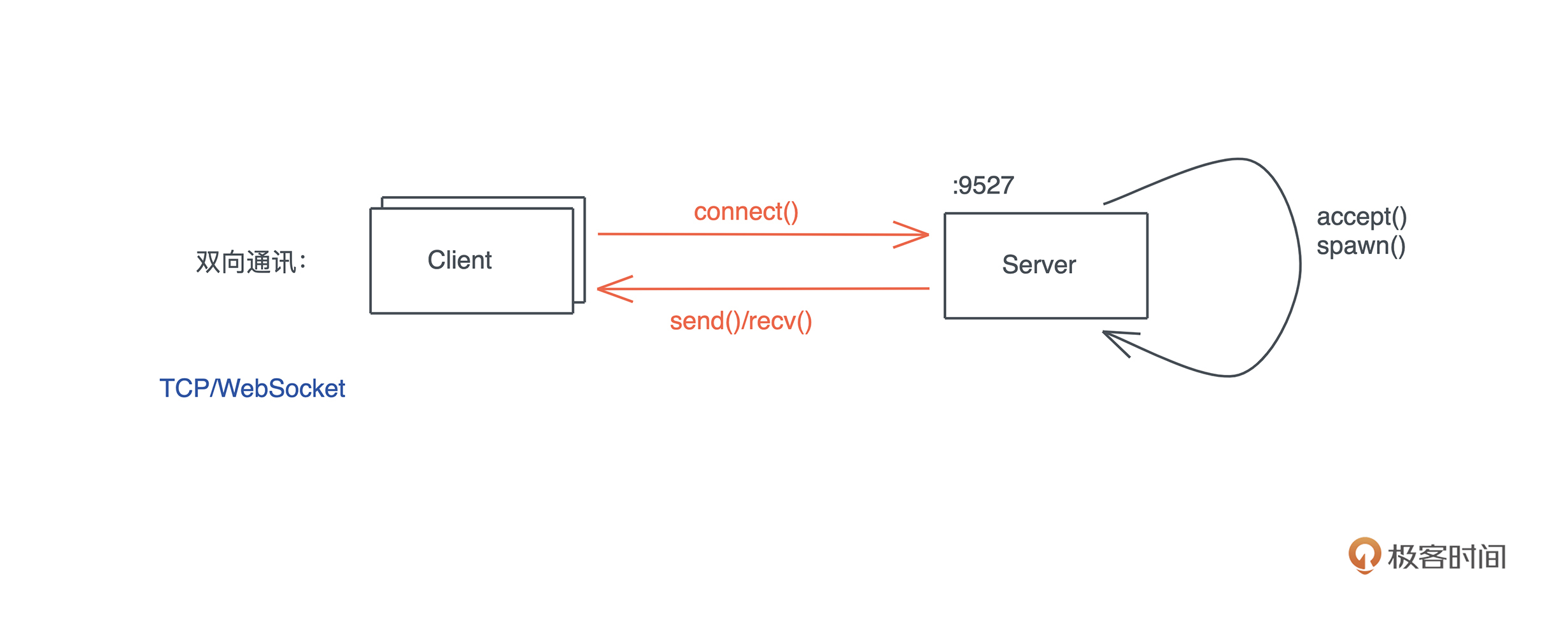 上一讲 TCP 服务器的例子里,所做的都是双向通讯。这是最典型的一种通讯方式: