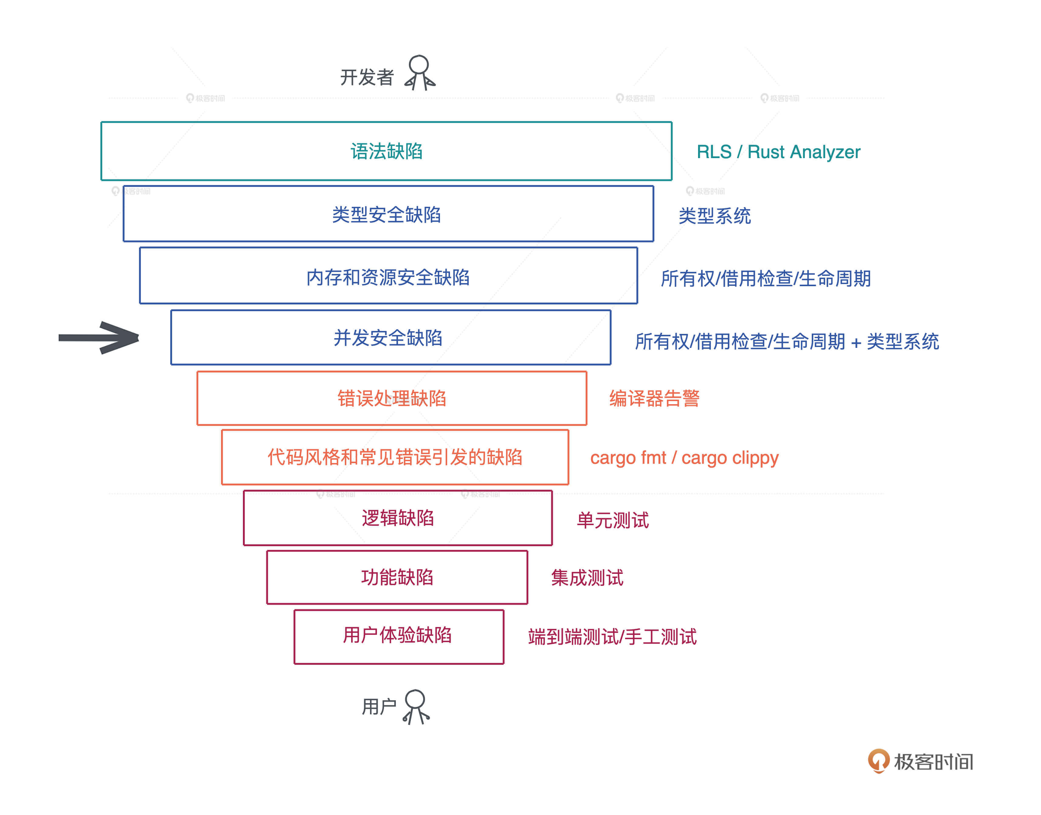 但是你一旦拿下这个难点,其他的知识点就是所有权和生命周期概念在不同领域的具体使用,比如,所有权和生命周期如何跟类型系统结合起来保证并发安全、生命周期标注如何参与到泛型编程中等等。