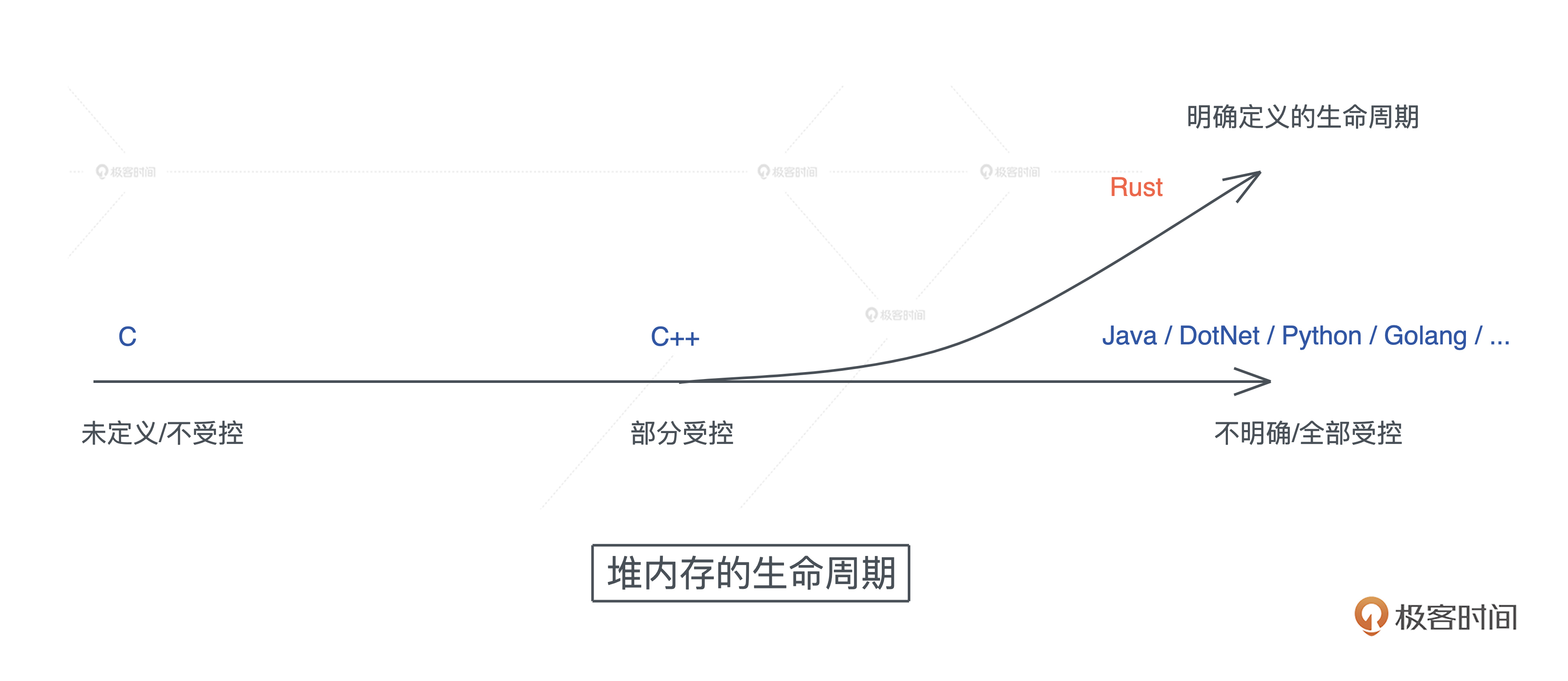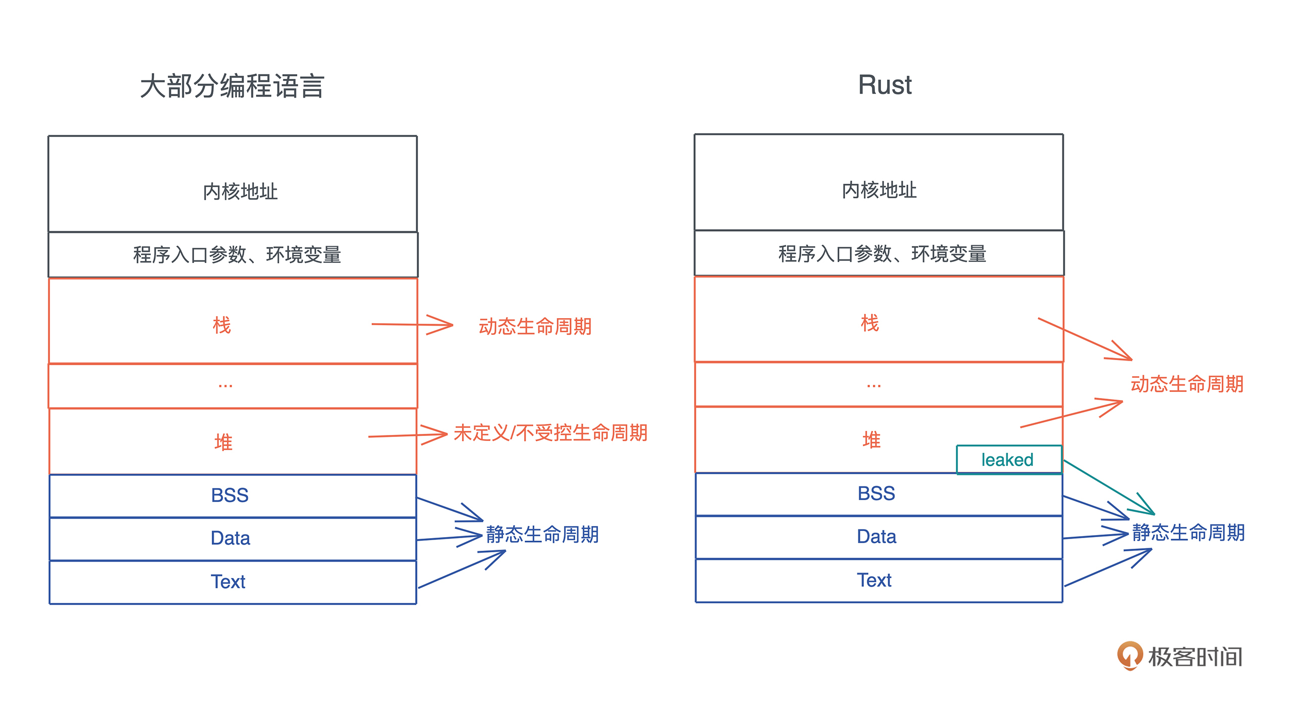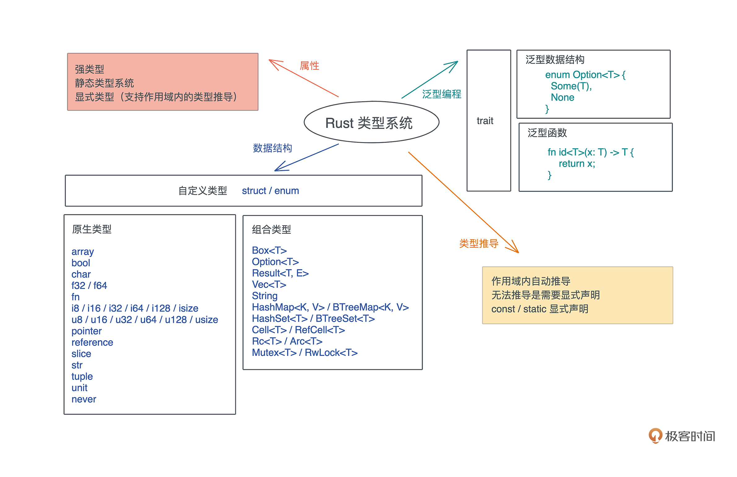 但是你一旦拿下这个难点,其他的知识点就是所有权和生命周期概念在不同领域的具体使用,比如,所有权和生命周期如何跟类型系统结合起来保证并发安全、生命周期标注如何参与到泛型编程中等等。
