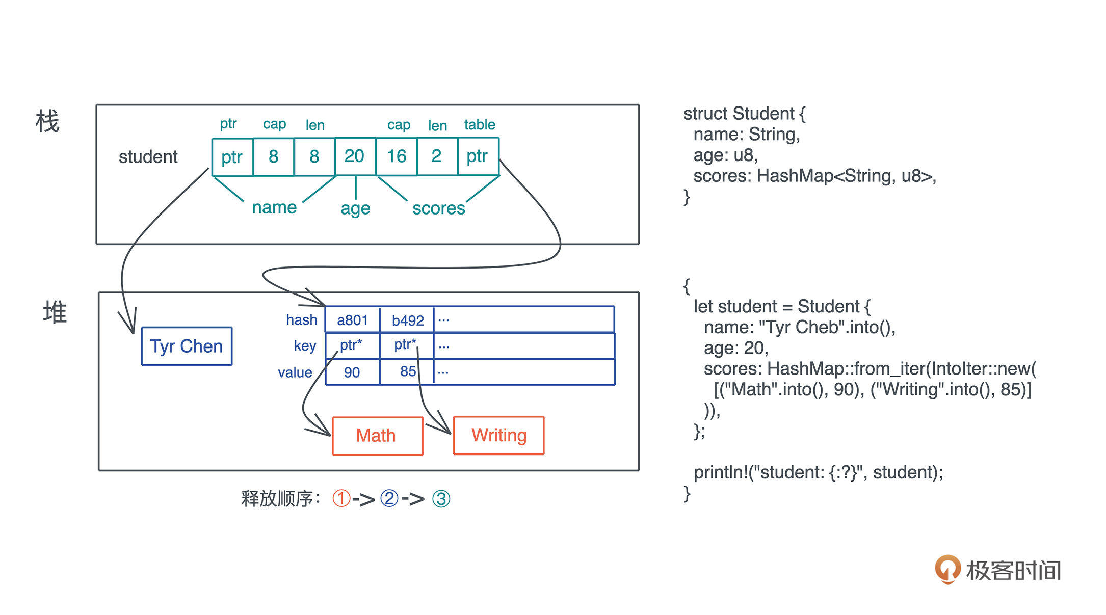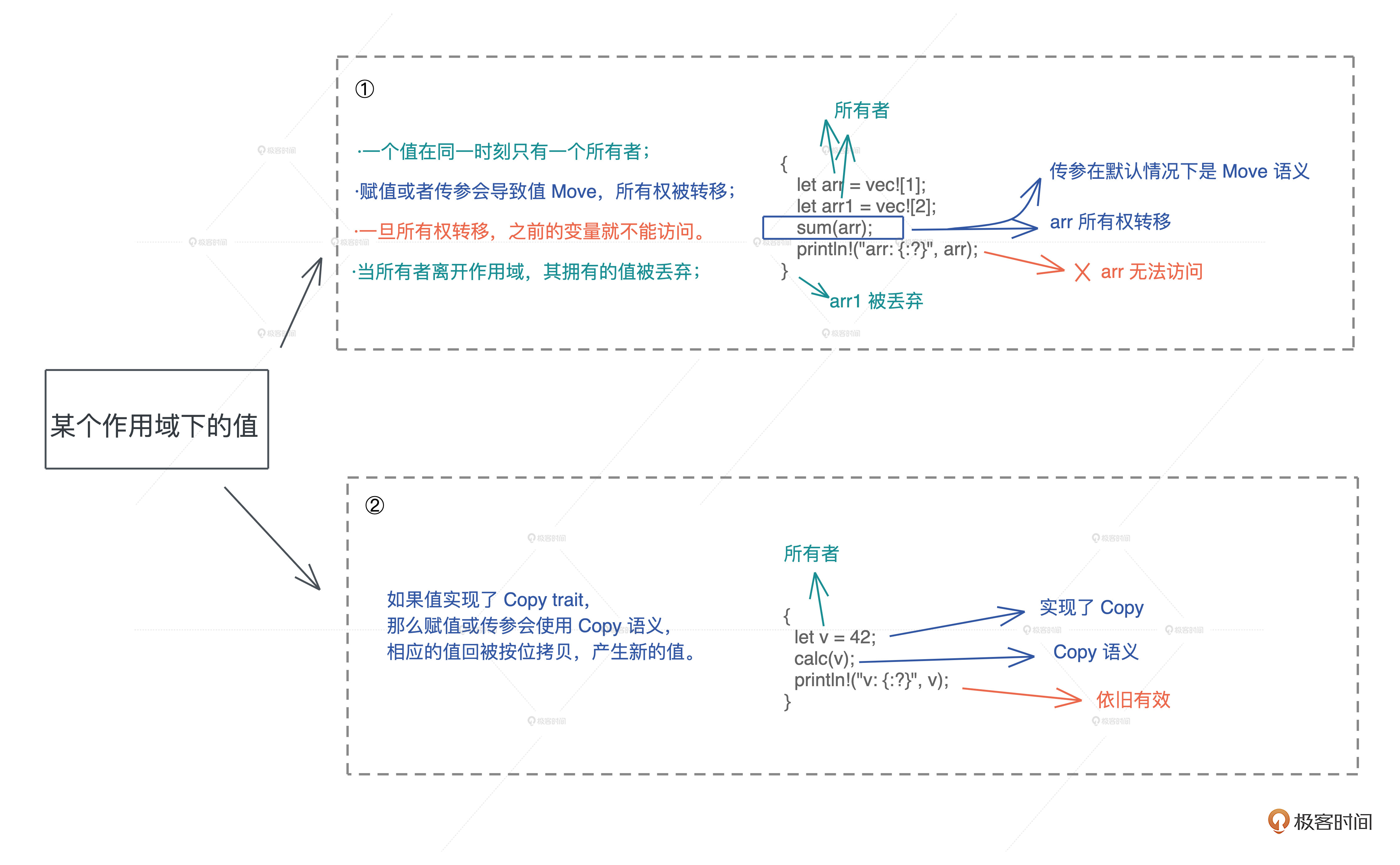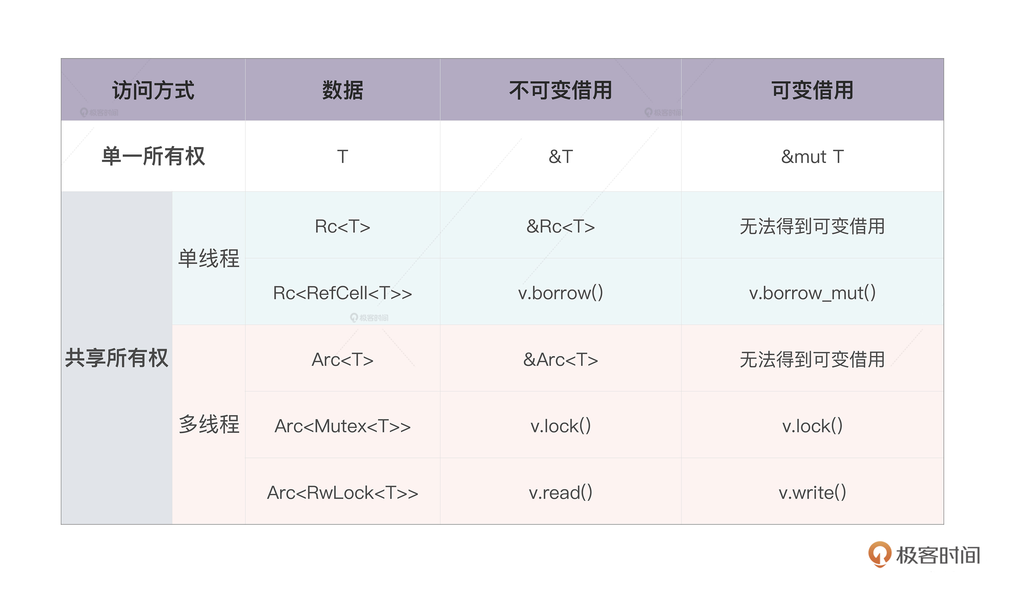 但是你一旦拿下这个难点,其他的知识点就是所有权和生命周期概念在不同领域的具体使用,比如,所有权和生命周期如何跟类型系统结合起来保证并发安全、生命周期标注如何参与到泛型编程中等等。