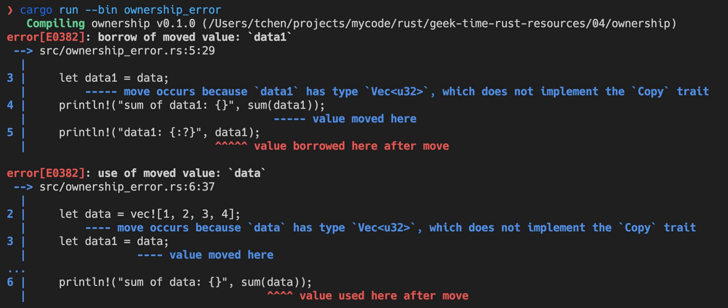 Rust 编译器,不仅能够通过类型安全在编译期检测出这一错误,告诉你这个错误产生的原因:“may outlive borrowed value”(我们暂且不管它是什么意思),并且,它还进一步推荐你加入 “move” 解决这个错误。为了方便你进一步了解错误详情,它还贴心地给出一个命令行 “rustc --explain E0373”,让你可以从知识库中获取更多的信息: