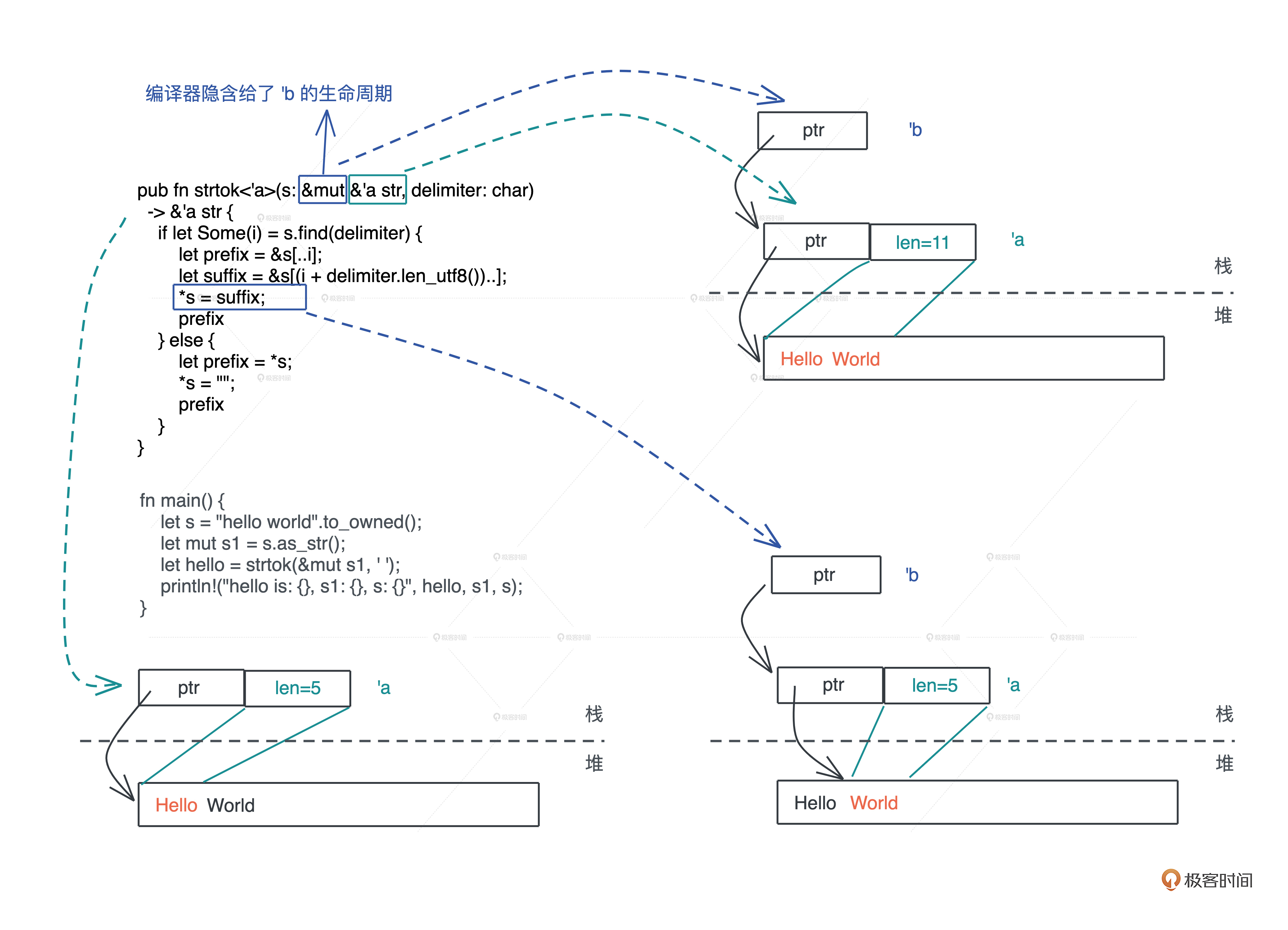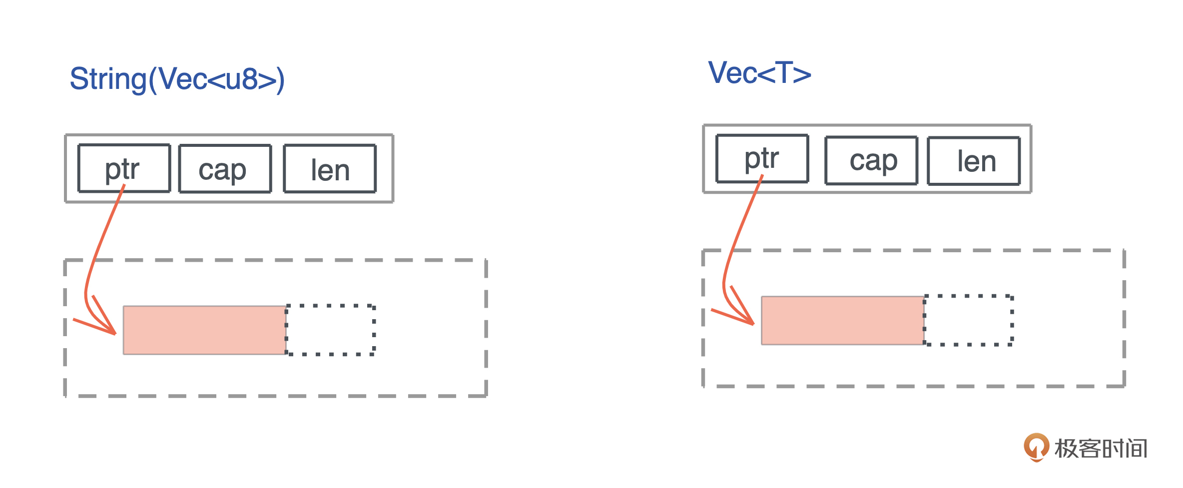 当我们把堆上的数据赋值给 s 时,s 作为分配在栈上的一个变量,它需要知道堆上内存的地址,另外由于堆上的数据大小不确定且可以增长,我们还需要知道它的长度以及它现在有多大。