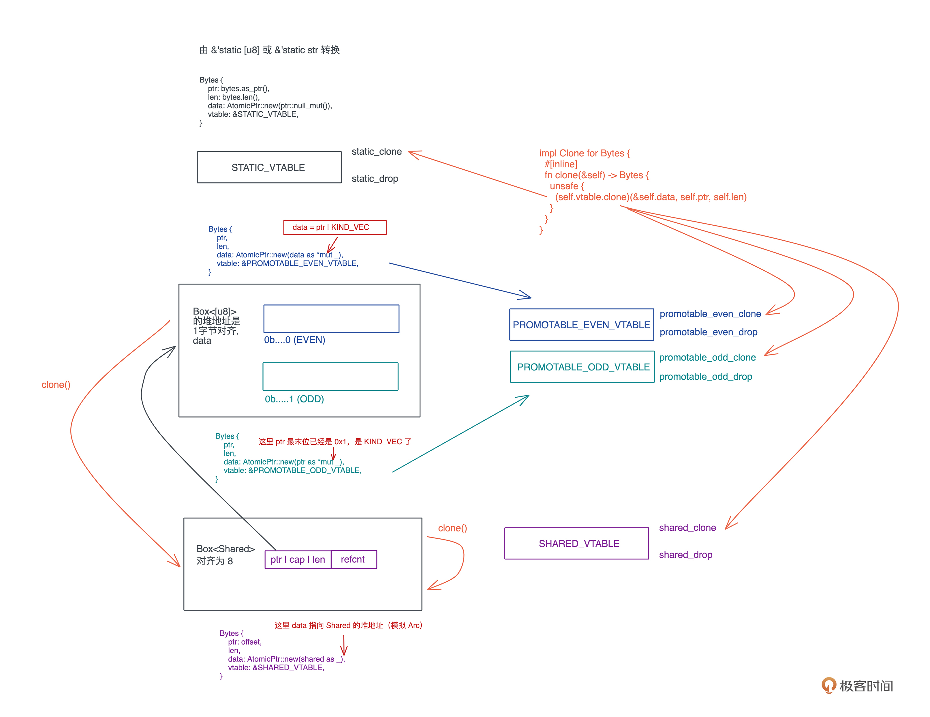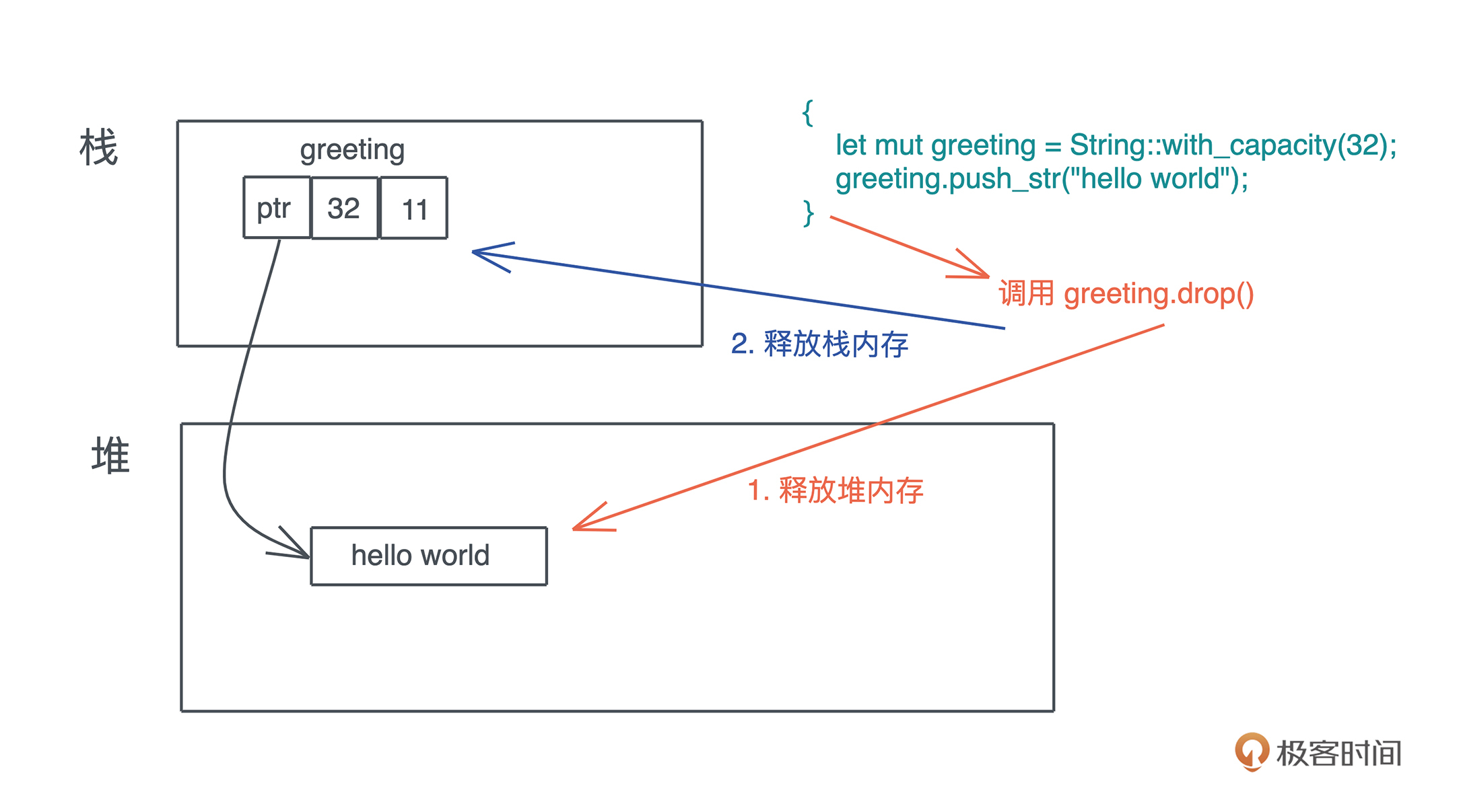 当执行 “hello world”.to_string() 时,在堆上,一块新的内存被分配出来,并把 “hello world” 逐个字节拷贝过去。