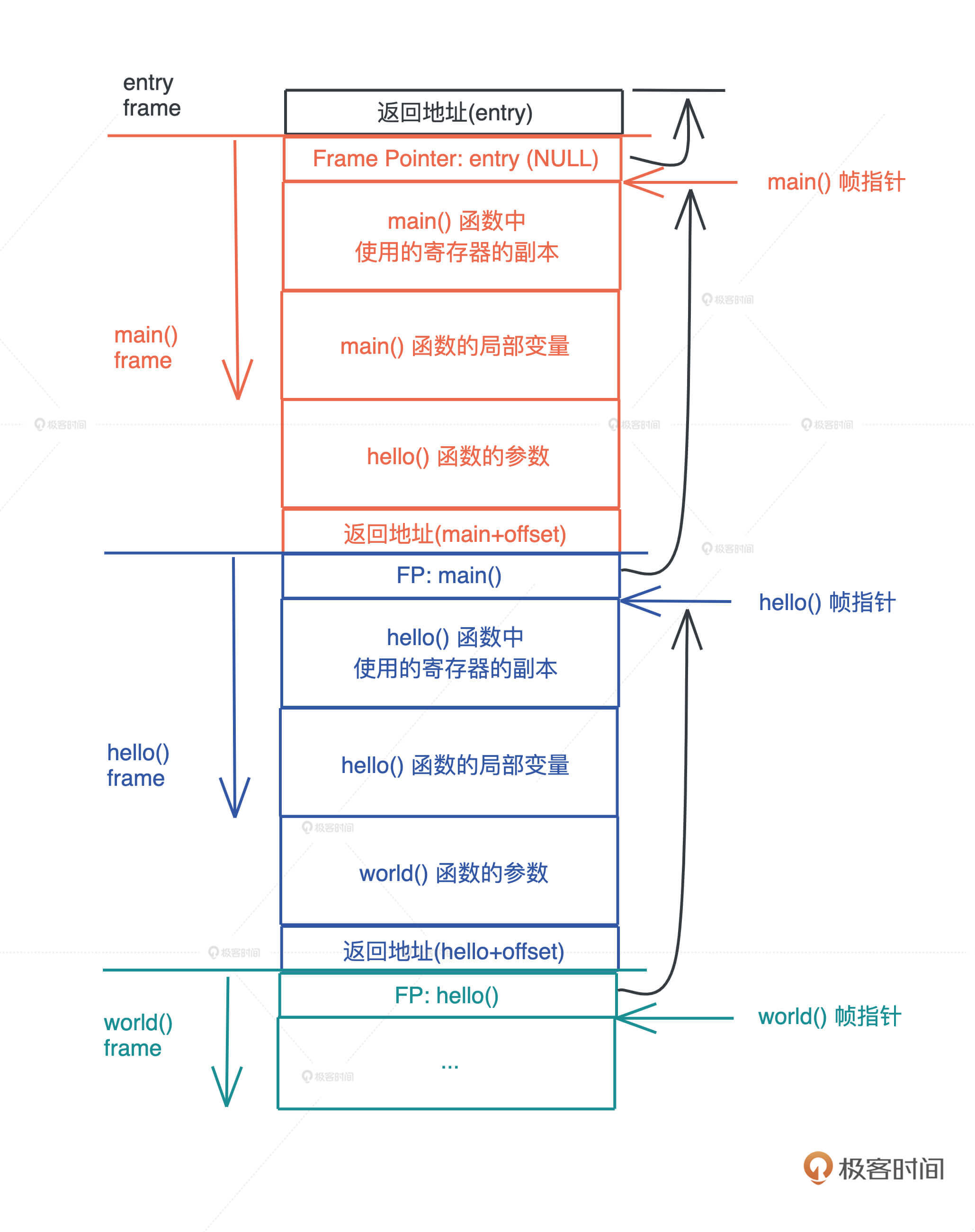 栈是程序运行的基础。每当一个函数被调用时,一块连续的内存就会在栈顶被分配出来,这块内存被称为帧(frame)。