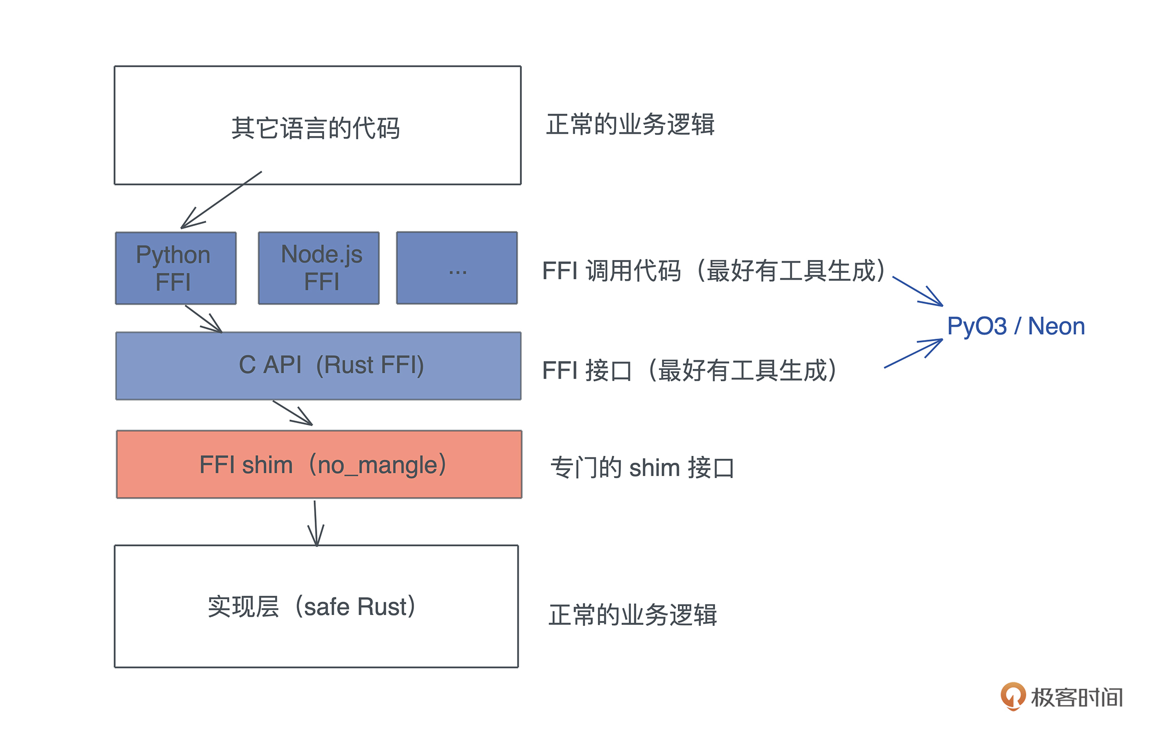 最后我们还会讲到 FFI,这是 Rust 和其它语言互通操作的桥梁。掌握好 FFI,你就可以用 Rust 为你的 Python/JavaScript/Elixir/Swift 等主力语言在关键路径上提供更高的性能,也能很方便地引入 Rust 生态中特定的库。