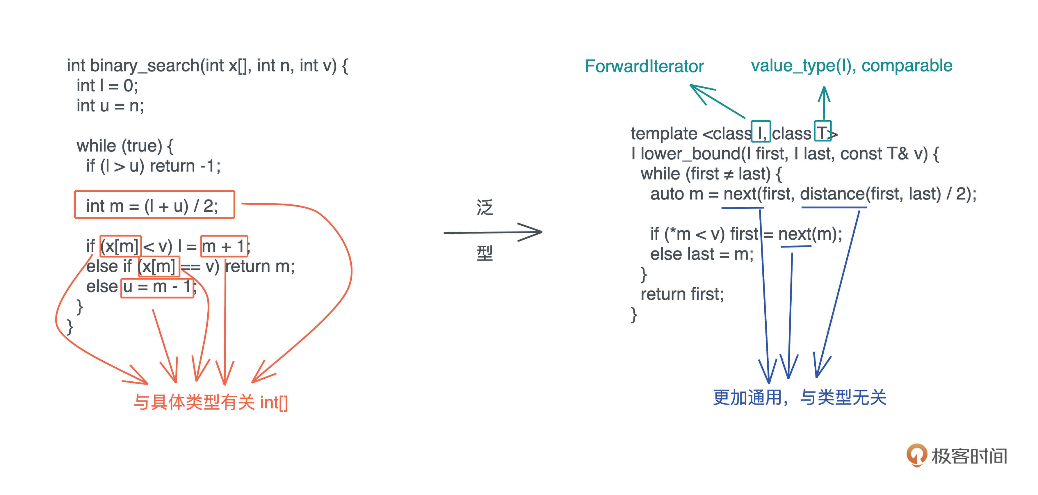 左边用 C 撰写的二分查找,标记的几处操作隐含着和 int[] 有关,所以如果对不同的数据类型做二分查找,实现也要跟着改变。右边 C++ 的实现,对这些地方做了抽象,让我们可以用同一套代码二分查找迭代器(iterator)的数据类型。