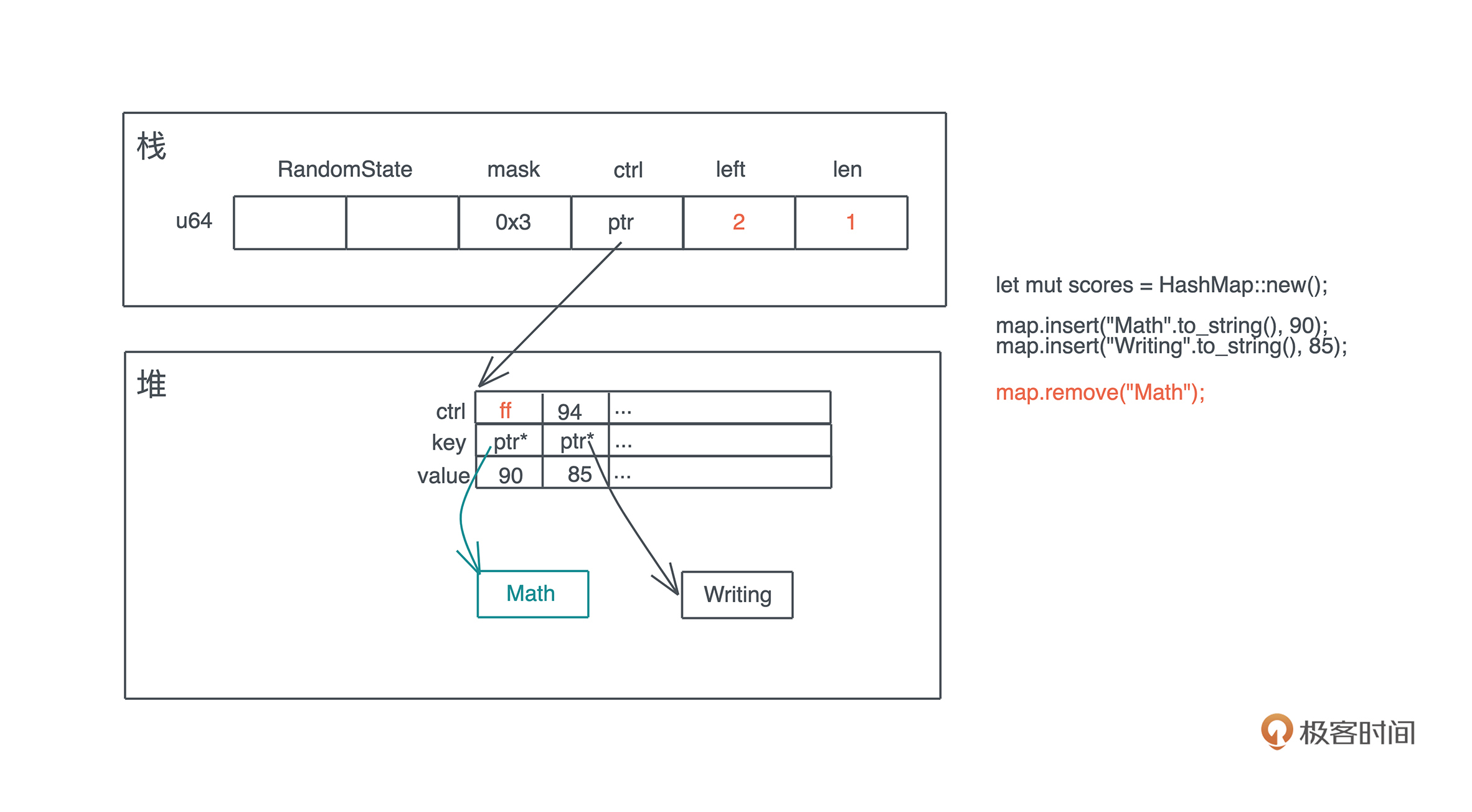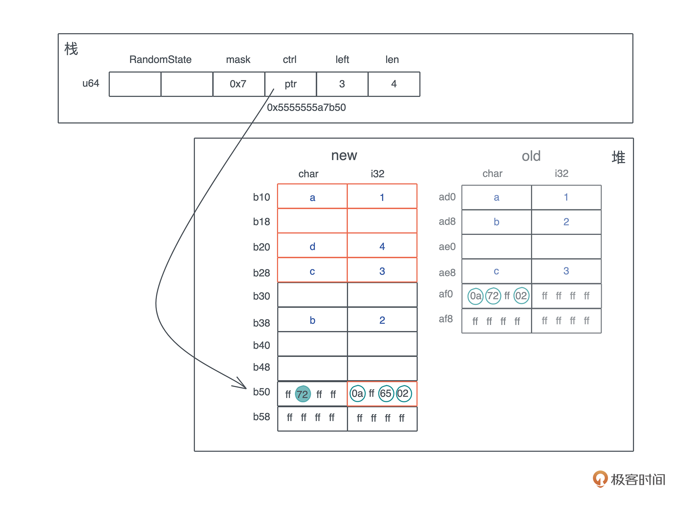 这会导致分配新的堆内存,然后原来的 ctrl table 和对应的kv数据会被移动到新的内存中。这个例子里因为 char 和 i32 实现了 Copy trait,所以是拷贝;如果 key 的类型是 String,那么只有 String 的 24 个字节 (ptr|cap|len) 的结构被移动,String 的实际内存不需要变动。