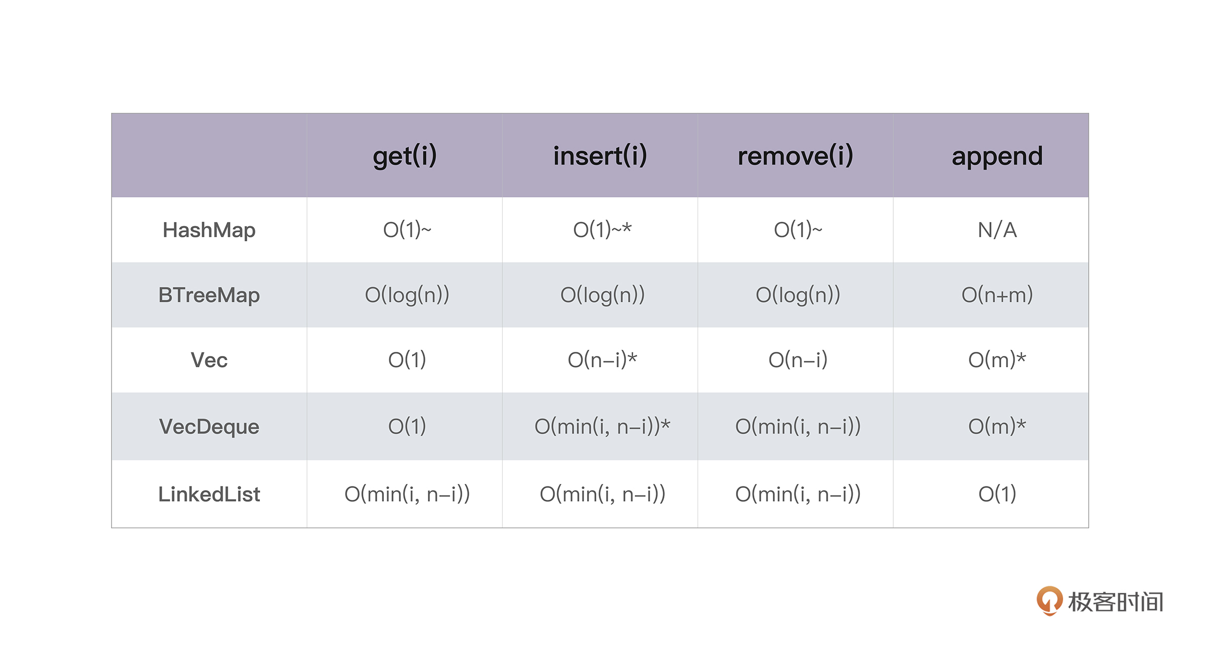 集合类型我们就暂时讲解到这里,未来实战要使用到某些数据结构时,比如 VecDeque,我们再深入探索。其他的集合类型,你也可以在要用的时候自行阅读 文档。