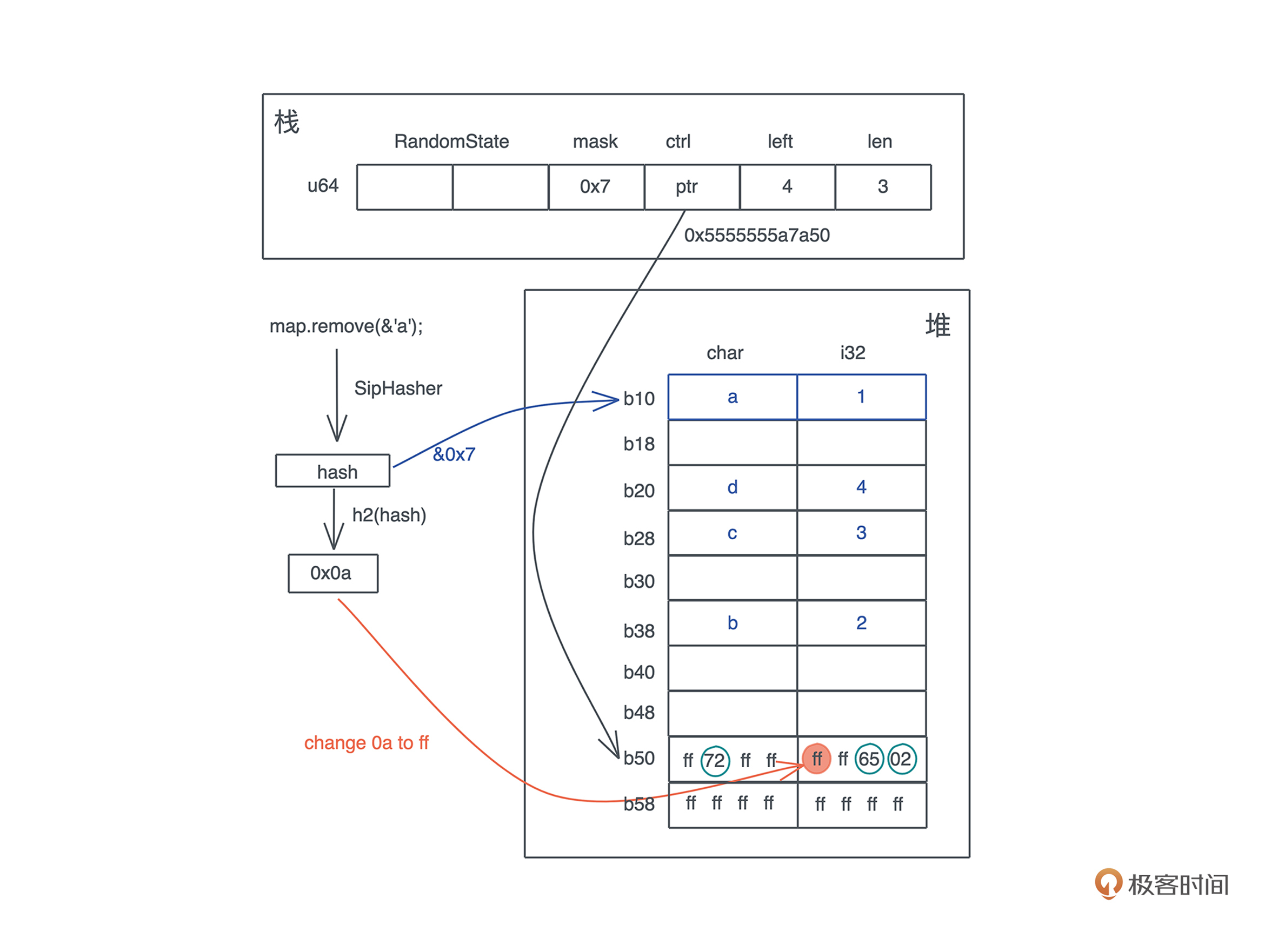 所以,当 HashMap 插入和删除数据,以及因此导致重新分配的时候,主要工作就是在维护这张 ctrl 表和数据的对应。
