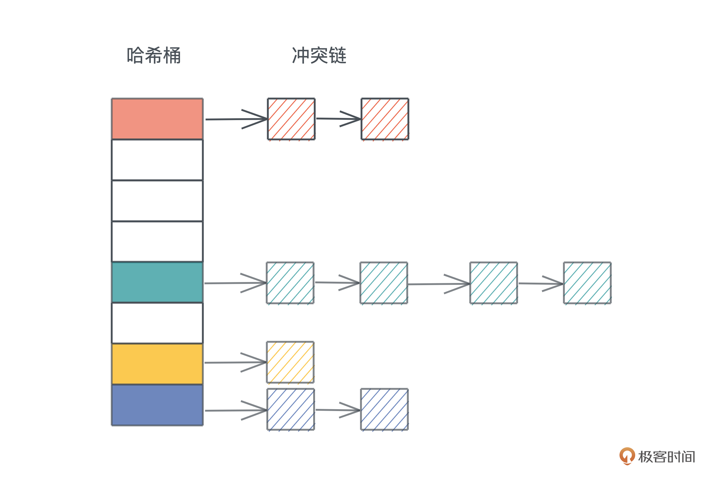 冲突链处理哈希冲突非常直观,很容易理解和撰写代码,但缺点是哈希表和冲突链使用了不同的内存,对缓存不友好。