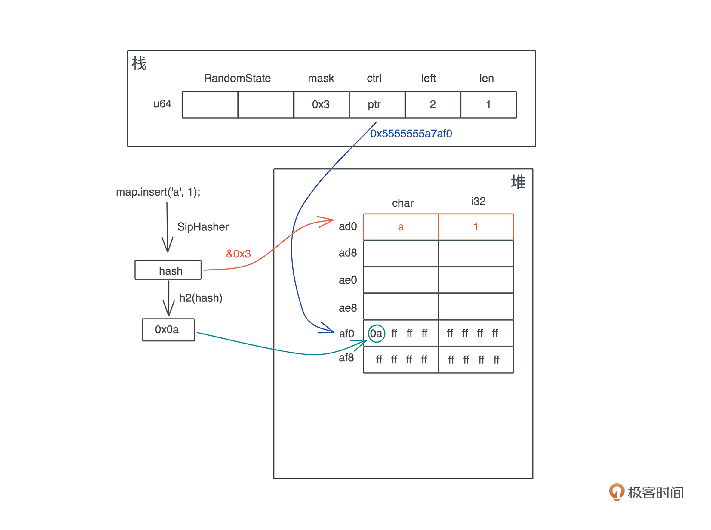 key ‘a’ 的 hash 和 bucket_mask 0x3 运算后得到第 0 个位置插入。同时,这个 hash 的头 7 位取出来,在 ctrl 表中对应的位置,也就是第 0 个字节,把这个值写入。