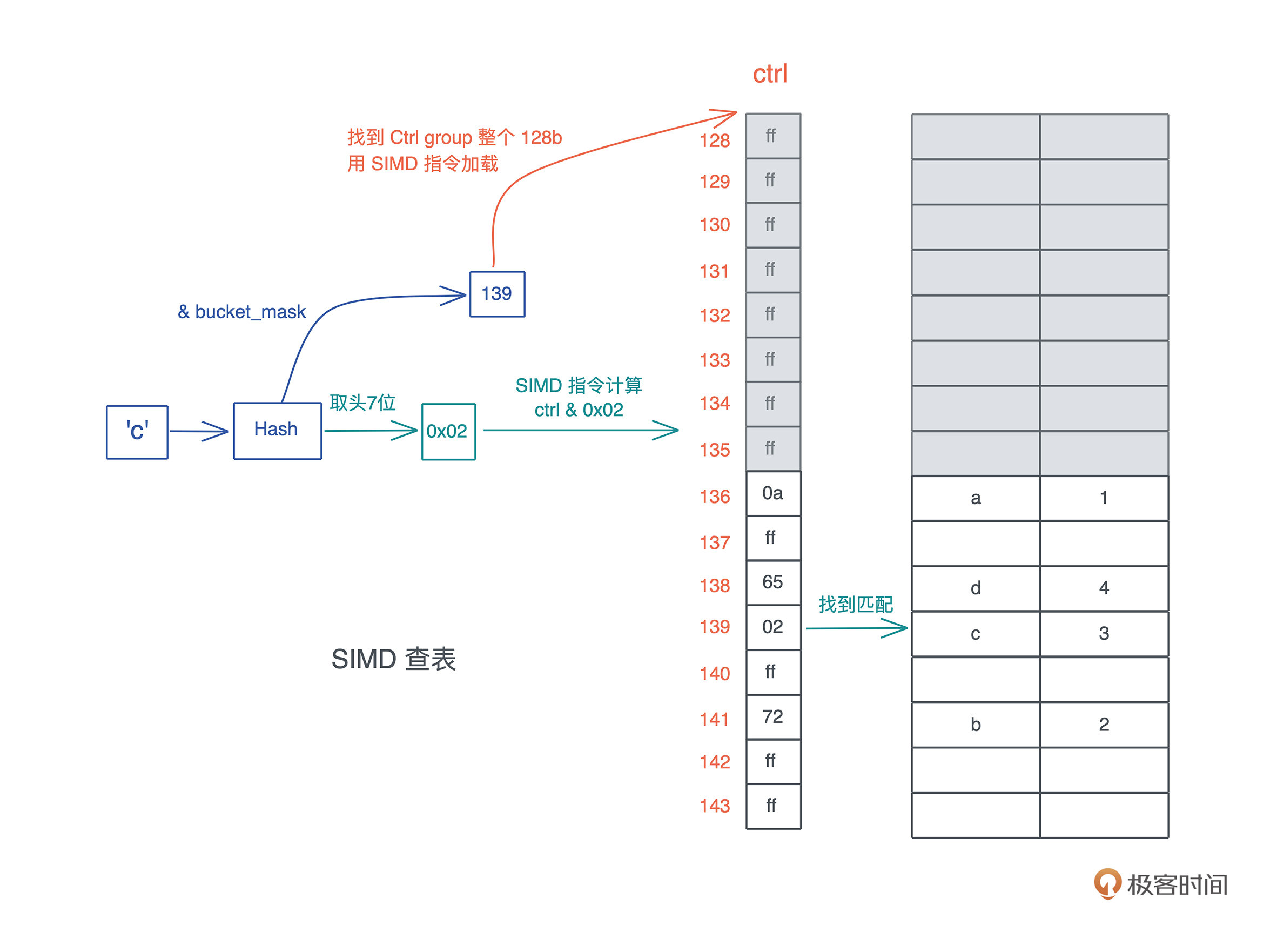 而另一个关键词,使用 SIMD 做单指令多数据的查表,也和一会要讲到 Rust 哈希表巧妙的内存布局息息相关。